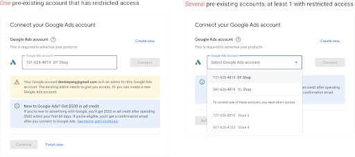 ผู้ใช้อาจมีระดับการเข้าถึงบัญชี Google Ads ที่แตกต่างกัน เนื่องจากผู้ใช้จะเชื่อมต่อบัญชี Google Ads ที่มีสิทธิ์แก้ไขได้เท่านั้น ให้แจ้งผู้ใช้เกี่ยวกับกรณีปัญหาการเข้าถึง ด้านล่างนี้เป็นตัวอย่างหน้าตาของส่วนนี้