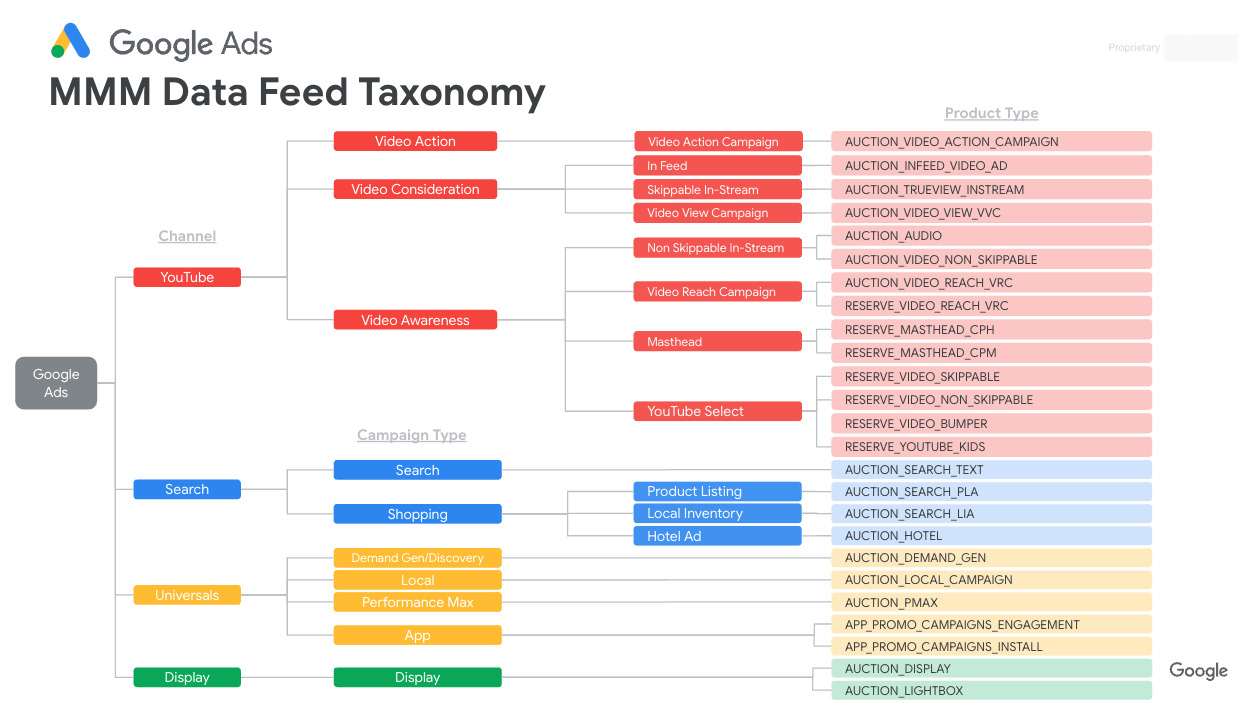 En la siguiente imagen, se muestra una taxonomía general correspondiente a un feed de datos de Google Ads (haz clic en la imagen para agrandarla).