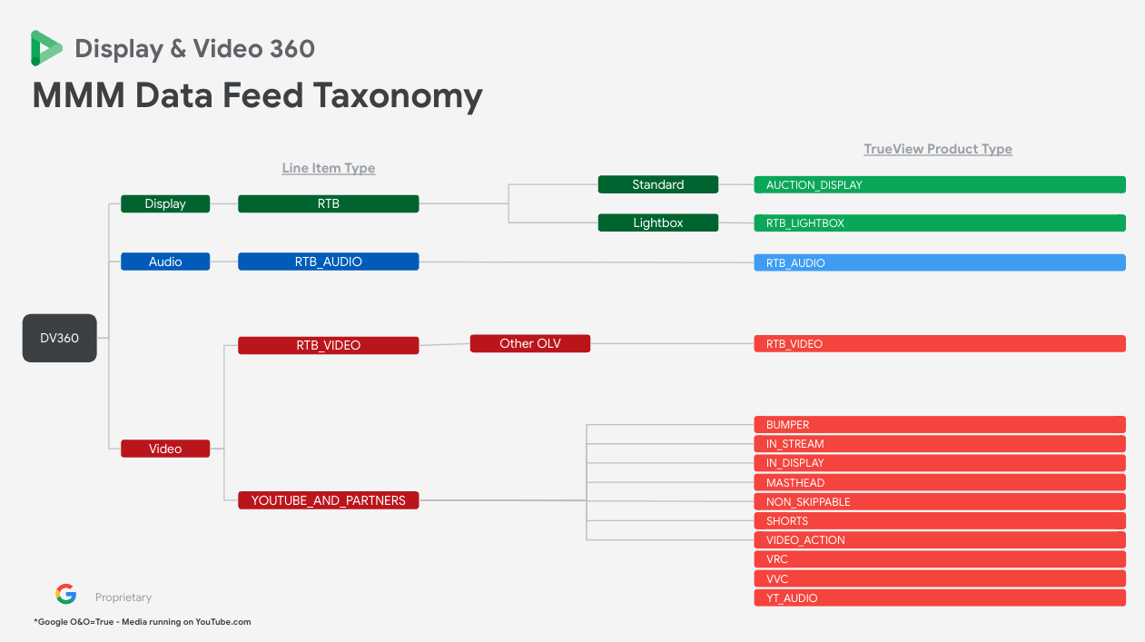 A imagem a seguir mostra níveis superiores em uma taxonomia de feed de dados para o Display & Video 360. Clique na imagem para ampliar.