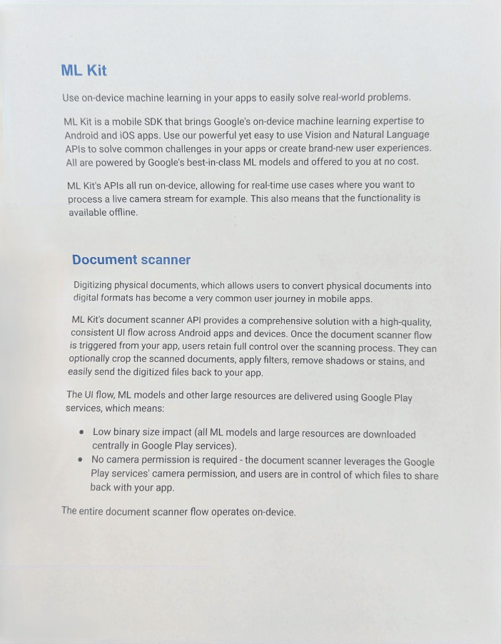 物理ドキュメントをデジタル化して、ユーザーが物理ドキュメントをデジタル形式に変換できるようにすることは、モバイルアプリで非常に一般的なユーザー ジャーニーになっています。ML Kit のドキュメント スキャナ API は、Android アプリとデバイス全体で高品質で一貫性のある UI フローを実現する包括的なソリューションを提供します。アプリからドキュメント スキャナ フローがトリガーされると、ユーザーはスキャン プロセスを完全に制御できます。スキャンしたドキュメントをトリミングしたり、フィルタを適用したり、影や汚れを取り除いたりして、デジタル化したファイルをアプリに簡単に送り返すこともできます。