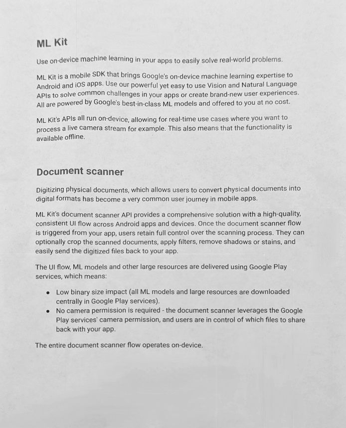 Digitalizacja dokumentów fizycznych, która umożliwia użytkownikom przekształcanie dokumentów fizycznych w formaty cyfrowe, stała się bardzo popularną ścieżką użytkownika w aplikacjach mobilnych. Interfejs API skanera dokumentów ML Kit to kompleksowe rozwiązanie z wysokiej jakości, spójnym interfejsem użytkownika w aplikacjach i na urządzeniach z Androidem. Po uruchomieniu w aplikacji procesu skanowania dokumentów użytkownicy zachowują pełną kontrolę nad procesem skanowania. Mogą opcjonalnie przyciąć zeskanowane dokumenty, zastosować filtry, usunąć cienie lub plamy i łatwo przesłać zdigitalizowane pliki z powrotem do Twojej aplikacji.