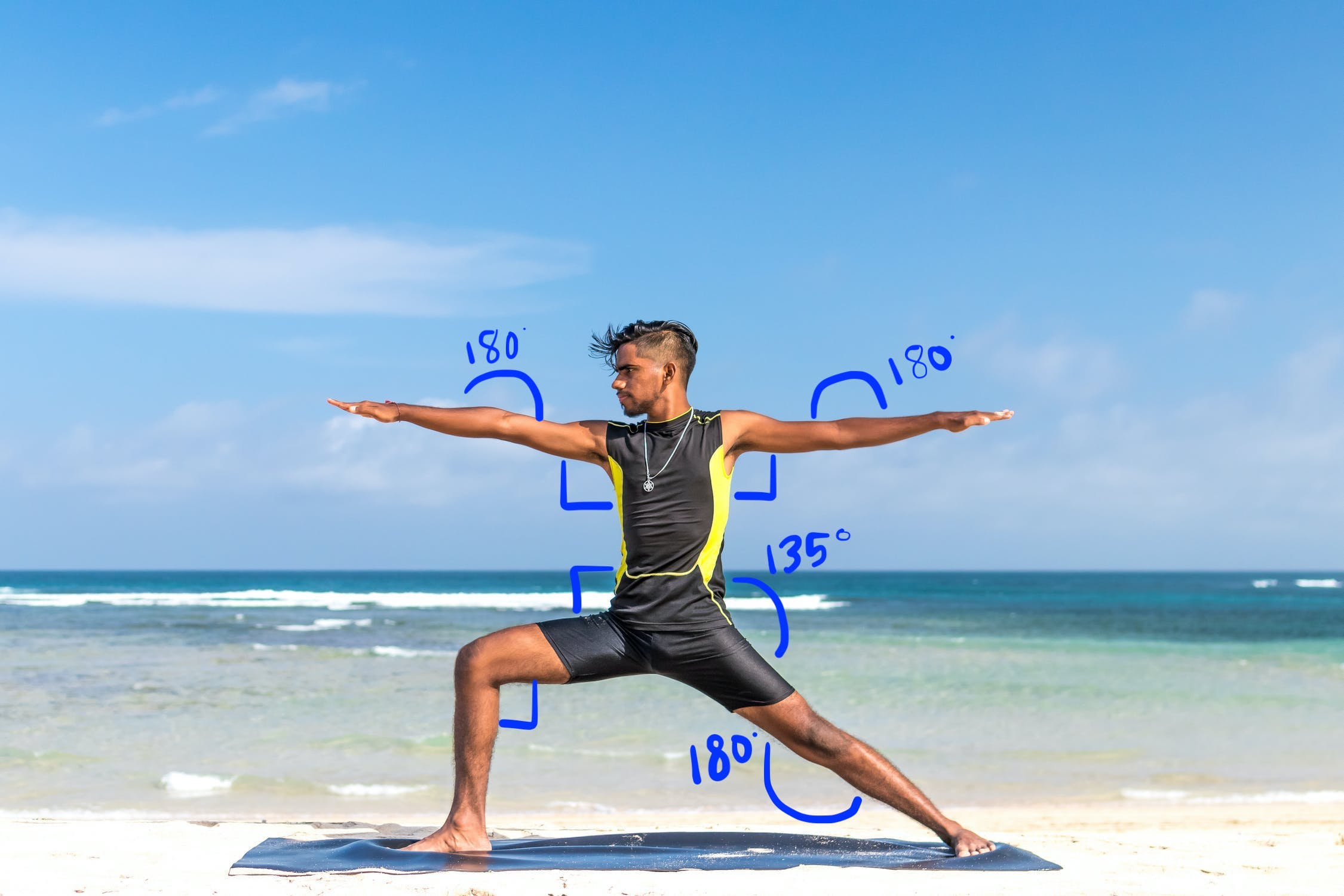 Você pode identificar uma postura de ioga calculando os ângulos de várias articulações. Para exemplo, a Figura 2 abaixo mostra a postura de ioga do Guerreiro II. Os ângulos aproximados que identificam esta posição estão escritas em: