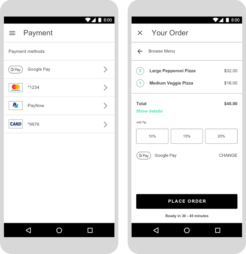 Définir Google Pay comme option de paiement principaleDans la mesure du possible, affichez le bouton Google Pay de manière bien visible et envisagez de le définir comme option de paiement par défaut ou unique.