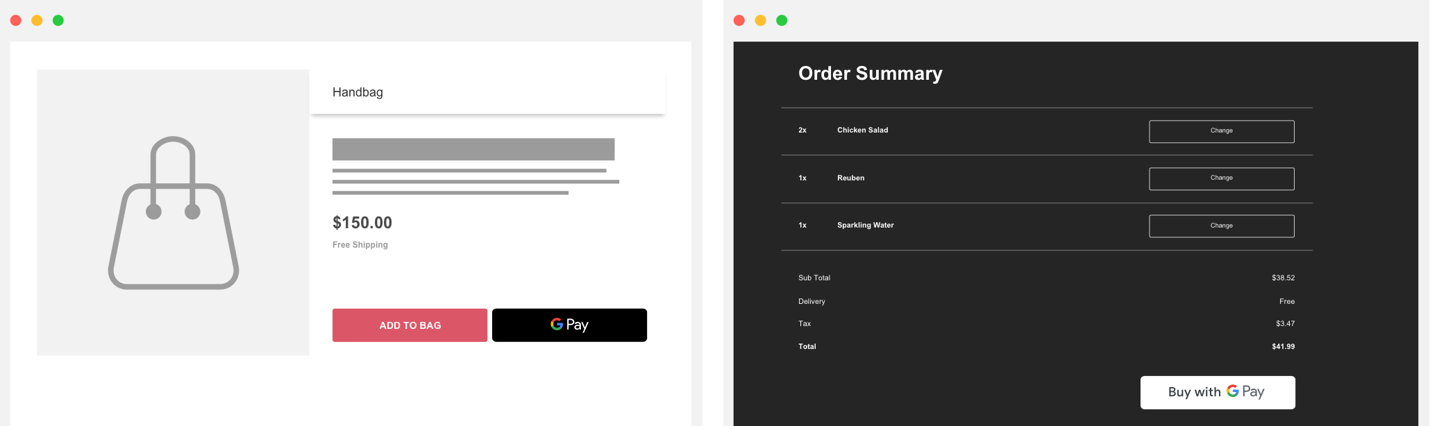 - 在確認頁面和電子郵件收據中顯示付款資訊時,請務必向消費者說明他們是透過 Google Pay 付款,並確保 Google Pay 的顯示方式與其他付款方式一致。