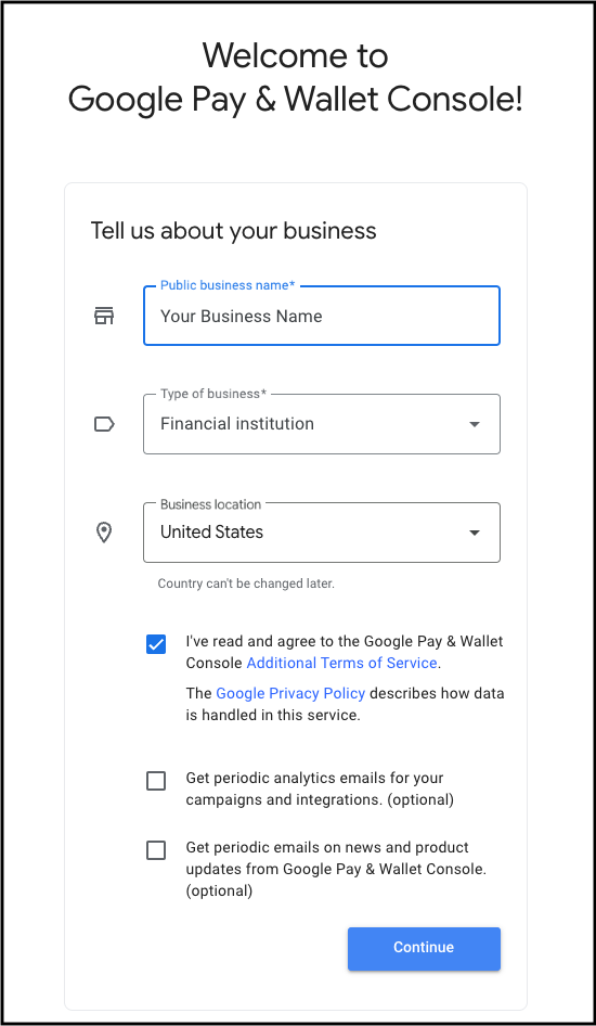 Comece adicionando as informações do signatário autorizado da sua instituição financeira. O endereço de e-mail fornecido nesta seção vai receber o NDA primeiro. Depois que ele for assinado, o signatário vai receber o contrato de clicar para aceitar (CTA) do Google Pay. O NDA e o CTA serão enviados do endereço de e-mail dse_na2@docusign.net.