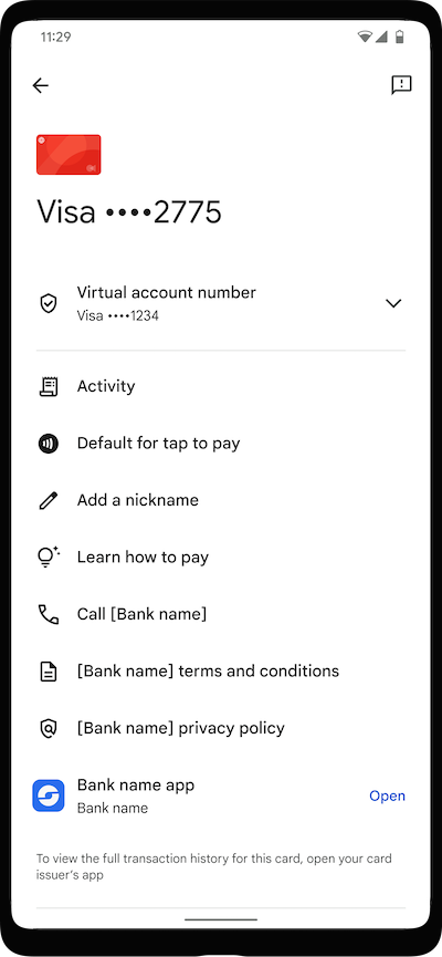 Nombre del paquete: El nombre del paquete de tu app de banca electrónica para dispositivos móviles. El nombre del paquete se usa para mostrar un vínculo a tu app en la vista de detalles de la tarjeta de un token. Las entidades emisoras deben proporcionar solo su nombre de paquete. Un error común es que las entidades emisoras hacen referencia a parte de la URL (o a la URL completa) de su app en Play Store. Aunque intentamos detectar estos errores comunes cuando renderizamos el vínculo, recomendamos que la entidad emisora establezca correctamente este parámetro en la configuración del token.