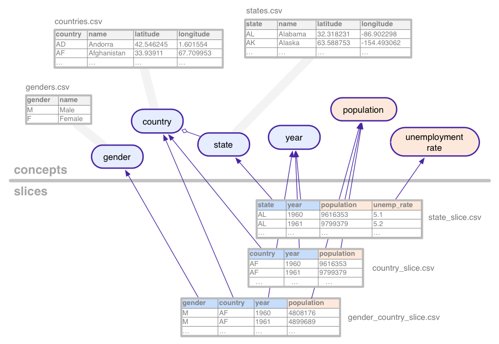 שימו לב שיצרנו את הערך 'sparse' של הכיתובים. לא הכול המדדים זמינים לכל המאפיינים: האוכלוסייה היא זמין עבור מדינות ומדינות בארה"ב, על בסיס שנתי, בזמן האבטלה התעריף זמין רק למדינות. הפירוט לפי מגדר זמין לאוכלוסייה לפי מדינות בלבד; הוא לא זמין לשיעור אבטלה ולא למאפיין המצב. יכול להיות שיש הפרדה גם בנתונים ברמה מסוימת, כאשר למדדים מסוימים אין ערכים עבור ערכי מאפיינים מסוימים, אבל הוא לא מיוצג ב-DSPL.