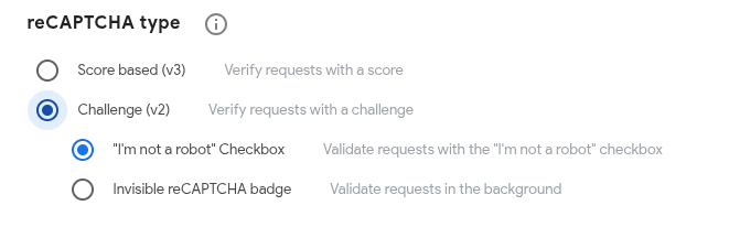 Ada tiga jenis reCAPTCHA yang dapat dipilih saat membuat situs baru. Jenis tambahan tersedia di Konsol Google Cloud.