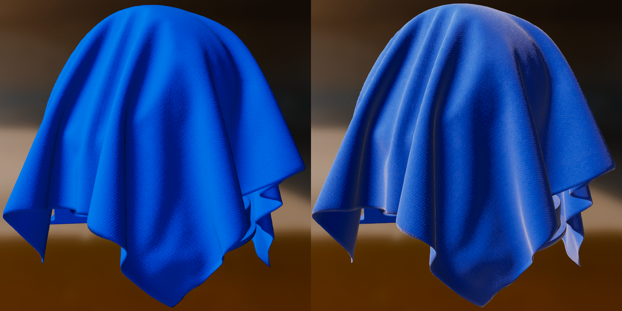 다음 이미지는 표준 모델(왼쪽)과 옷 모델 (오른쪽)을 사용하여 렌더링된 데님 패브릭을 비교합니다. 표준 머티리얼 모델이 데님 직물 샘플의 모양을 캡처하지 못하는 이유를 확인합니다 (왼쪽). 표면이 플라스틱과 유사하고 단단하게 표시되며 옷 조각보다 트랩과 더 유사합니다. 이는 흡수 및 산란으로 인한 더 부드러운 반사 로브가 직물의 충실한 재생성에 얼마나 중요한지를 보여줍니다.