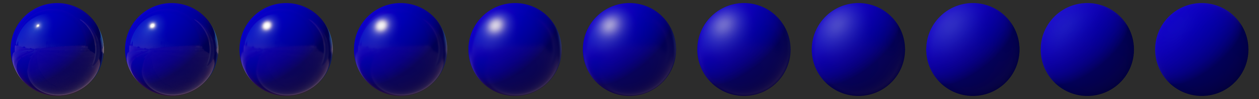 roughness 屬性可控制介面的感知平滑度。將 roughness 設為 0 時,表面可保持光滑流暢。表面越粗糙,就是「反映者」。反思就是這個屬性通常在其他引擎和工具中稱為「光暈」,正好與粗糙度 (roughness = 1 - glossiness) 相反。