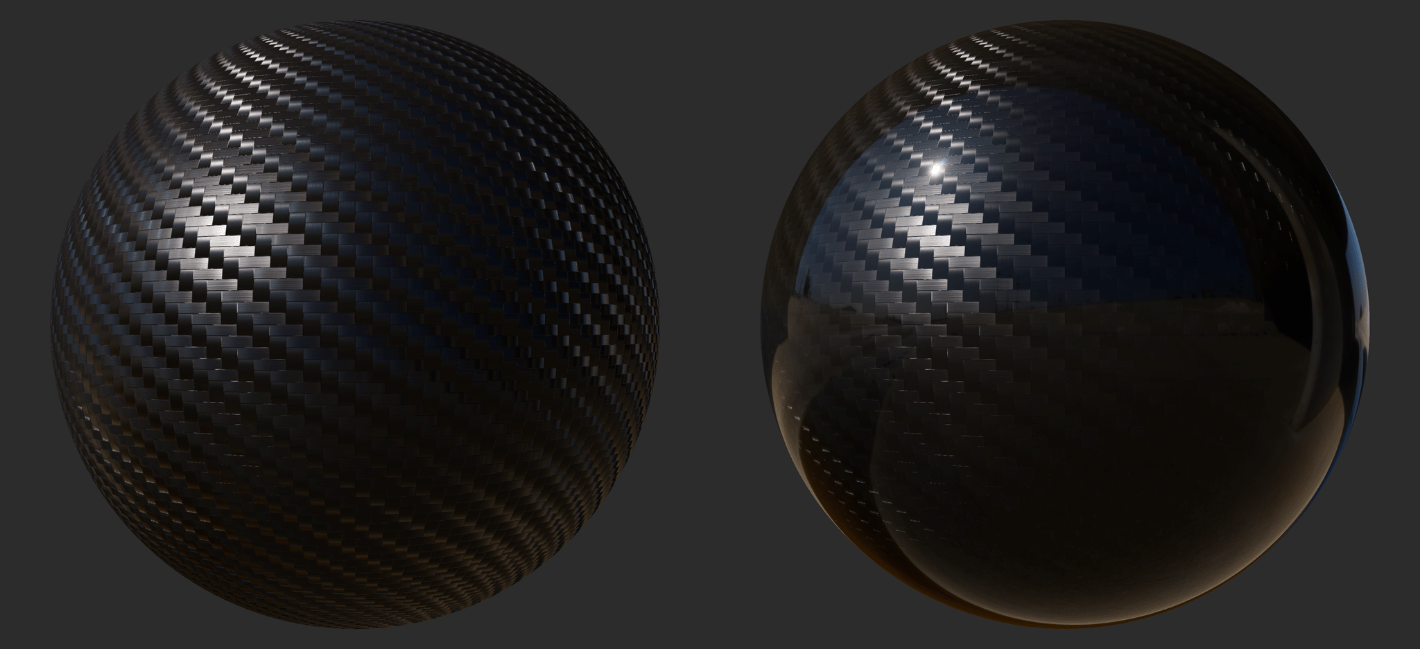Właściwość clearCoat służy do opisywania materiałów obejmujących 2 warstwy. Warstwa powłoki proszkowej jest zawsze izotropowa i elektryczna. Poniższy obraz porównuje materiał z włókna węglowego w ramach standardowego modelu materiału (po lewej) i w modelu z przezroczystą warstwą (po prawej).