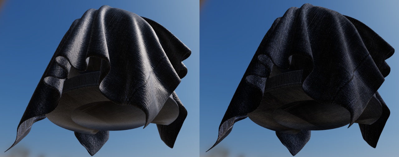 Hình ảnh sau đây so sánh vải denim được kết xuất bằng mô hình tiêu chuẩn (bên trái) và mẫu vải (bên phải). Hãy lưu ý cách mô hình material tiêu chuẩn không thể chụp giao diện của một mẫu vải denim (bên trái). Bề mặt trông có vẻ cứng nhắc (giống như nhựa), gần giống với một tấm vải hơn so với một mảnh quần áo. Điều này cũng cho thấy tầm quan trọng của khối phản xạ mềm hơn do quá trình hấp thụ và tán xạ có liên quan đến việc tái tạo vải.