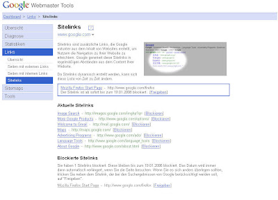 Jetzt gibt es in den Webmaster-Tools die Möglichkeit, potentielle Sitelinks auf eurer Website zu sehen und alle Sitelinks, die ihr nicht in den Suchergebnissen sehen wollt, zu entfernen. Da Sitelinks sehr nützlich sind, Usern die Navigation auf eurer Site zu erleichtern, empfehlen wir im Allgemeinen nicht, vorgeschlagene Sitelinks zu entfernen. Trotzdem kann es natürlich sein, dass ihr gelegentlich eine Seite von den Sitelinks ausschließen möchtet, da diese z. B. veraltet oder nicht mehr verfügbar ist oder einfach Informationen enthält, die ihr nicht hervorgehoben präsentieren möchtet. Wenn ihr eine Seite von den Sitelinks ausschließt, wird sie bei den Sitelinks über einen Zeitraum von 90 Tagen nicht angezeigt, ausser ihr entscheidet euch vor Ablauf der 90 Tage, die Seite doch hinzuzufügen. Es kann etwa eine Woche dauern, bis die gewünschte Seite aus den Sitelinks entfernt wird. Wir arbeiten jedoch daran, diesen Prozess zu beschleunigen.