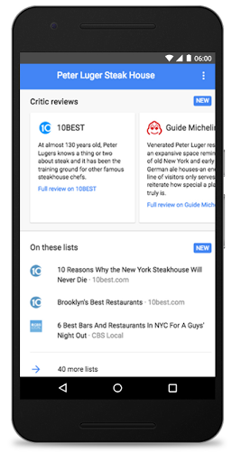 Os editores com avaliações da crítica para entidades locais podem começar a selecionar trechos de avaliações dos sites, além de anotar essas avaliações e a empresa associada com a marcação do schema.org. Esse processo, detalhado nas nossas instruções de marcação de avaliações da crítica, permite que os editores informem ao Google qual snippet preferem, qual URL está associado à avaliação e outros metadados sobre a empresa local que nos permite garantir que estamos exibindo a avaliação certa para a entidade certa.