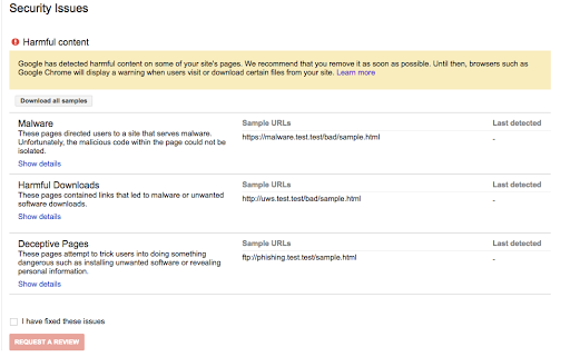 تقدّم المعلومات المعدَّلة تفسيرات أكثر تفصيلاً بخصوص ست مشاكل مختلفة مرتبطة بالأمان يتم رصدها من خلال ميزة "التصفّح الآمن"، بما في ذلك البرامج الضارة والصفحات المخادعة وعمليات التنزيل الضارة وعمليات التنزيل غير المألوفة. تقدّم هذه التفسيرات لمشرفي المواقع مزيدًا من السياق والتفاصيل حول المشاكل التي رصدَتها ميزة "التصفّح الآمن". نوفّر أيضًا اقتراحات مخصصة لكل نوع من المشاكل، بما في ذلك أمثلة على عناوين URL يمكن لمشرفي المواقع مراجعتها للتعرّف على مصدر المشكلة، بالإضافة إلى إجراءات إصلاح محدّدة يمكن لمشرفي المواقع اتّخاذها لحل المشكلة.