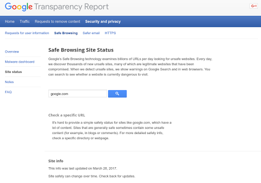 Этот инструмент представлен на сайте нашего Отчета о доступности сервисов и данных в разделе "Безопасный просмотр". Как и прочие разделы Отчета о доступности сервисов и данных, этот раздел содержит общедоступную информацию о статусе онлайн-ресурсов и о том, насколько они безопасны. Если в инструменте проверки статуса сайта указать адрес страницы (URL, сайт или домен), будут показаны самые последние результаты анализа этой страницы на соответствие критериям Безопасного просмотра. Также вы увидите ссылки на инструкции по устранению неполадок и обучающие материалы.