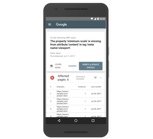 La nouvelle expérience de correction des pages AMP commence par le rapport sur les problèmes AMP. Ce rapport présente les problèmes AMP actuels que rencontre votre site, regroupés par erreur sous-jacente. Vous pouvez afficher le détail d'un problème pour obtenir plus d'informations, y compris pour consulter des exemples de pages affectées. Une fois le problème sous-jacent résolu, cliquez sur un bouton pour valider la correction, puis demandez à Google d'explorer de nouveau les pages concernées. Google vous informera de la progression de la réexploration et mettra à jour le rapport une fois les corrections validées.