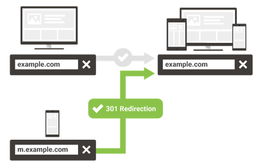 301en las antiguas URLs para móviles para que dirijan a las versiones adaptables (las páginas nuevas). Estas redirecciones se deben llevar a cabo por separado, desde cada URL para móviles a las URLs adaptables.