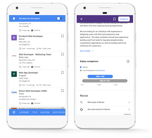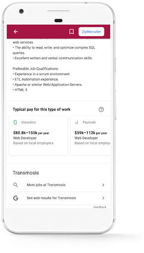 Im Juni haben wir eine neue Version angekündigt, mit der Stellensuchende jetzt die praktische Google Suche nutzen können. Heute machen wir den nächsten Schritt zur Verbesserung der Jobsuche bei Google. Wir fügen eine Funktion hinzu, die neben den Stellenausschreibungen auch Gehaltsschätzungen aus dem Web anzeigt. Außerdem fügen wir neue UI-Funktionen für Nutzer hinzu.