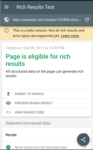 تركّز أداة الاختبار الجديدة على أنواع البيانات المنظَّمة المؤهّلة للظهور كنتائج غنية بصريًا. تسمح لك هذه الأداة باختبار جميع مصادر البيانات على صفحاتك، مثل JSON-LD (الذي ننصح به) أو البيانات الجزئية أو RDFa. توفّر الأداة الجديدة معلومات أكثر دقة عن مظهر الصفحة في محرّك بحث Google وتتضمن معالجة محسّنة للبيانات المنظَّمة المتوفرة في المحتوى الذي تم تحميله ديناميكيًا. تتوفّر الآن إمكانية إجراء اختبارات لوصفات الطعام والوظائف والأفلام والدورات التدريبية، إلا أنّها ليست سوى خطوة أولى، ونحن نخطّط للتوسع بمرور الوقت.