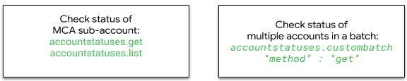 Você pode usar accountstatuses.get para conferir as informações de status de uma única conta do comerciante.