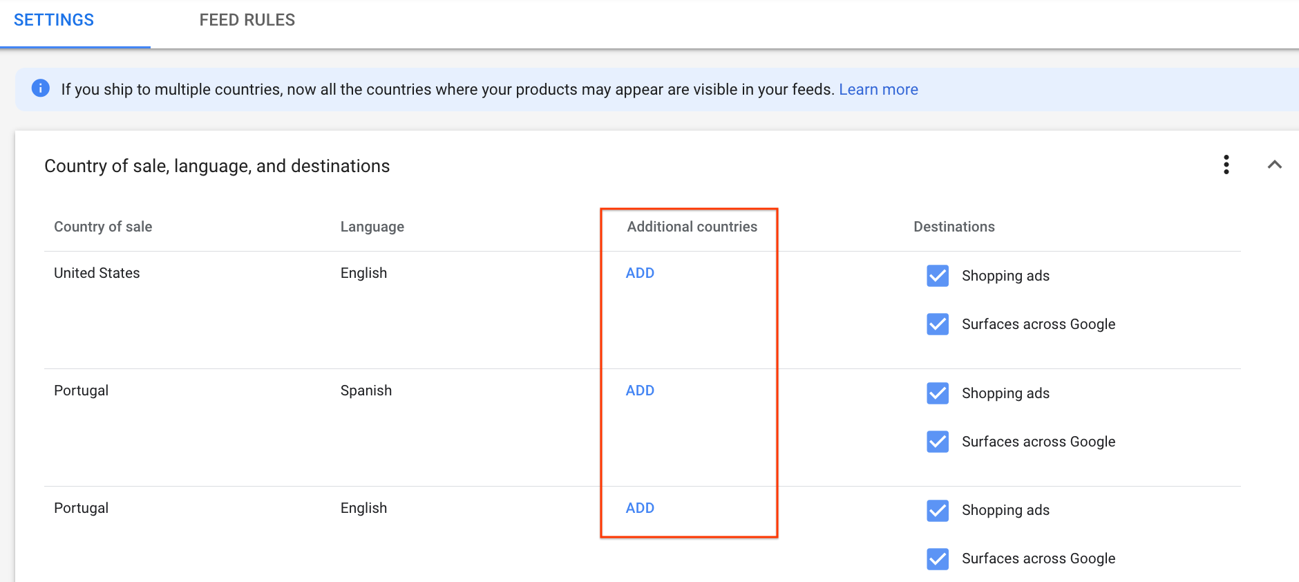 Content API를 통해 제출된 제품의 광고 및 무료 등록정보로 여러 국가를 타겟팅하려면 판매자 센터의 Content API 기본 피드에서 추가 국가를 구성하거나 products 리소스의 shipping 필드를 통해 이러한 추가 국가를 추가합니다.