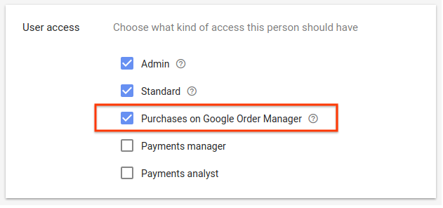 The Shopping Actions Order Manager role should appear next to the user in the user list. Repeat this process for all accounts that will access the Orders API or the Orders view in Merchant Center.