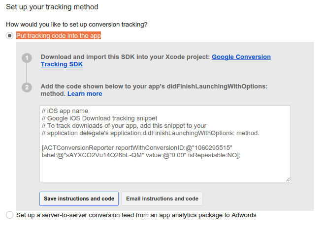 - 在「設定追蹤方式」下方,選取「將追蹤程式碼加進應用程式」。