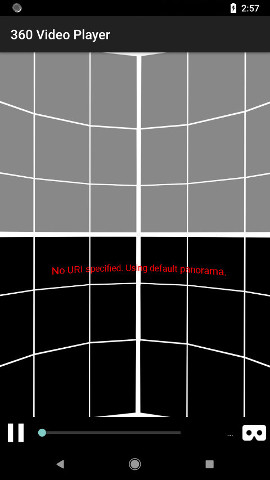 The Video360 sample is meant to be used as a basis for other apps rather than as a standalone video player so it has a minimal UI. After the app is installed and the user accepts permissions, it will render a placeholder panorama and allow the user to switch in and out of VR. When in VR, the user can use the Daydream Controller to interact with a floating 2D (non-VR) UI.