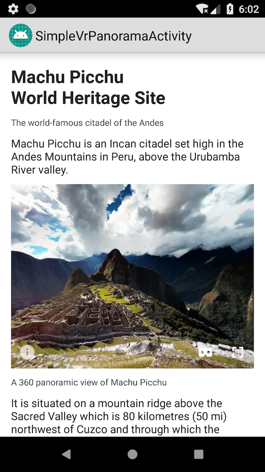 VrPanoramaView and VrVideoView are sample apps in the Google VR SDK for Android that let users view 360° photos and videos.