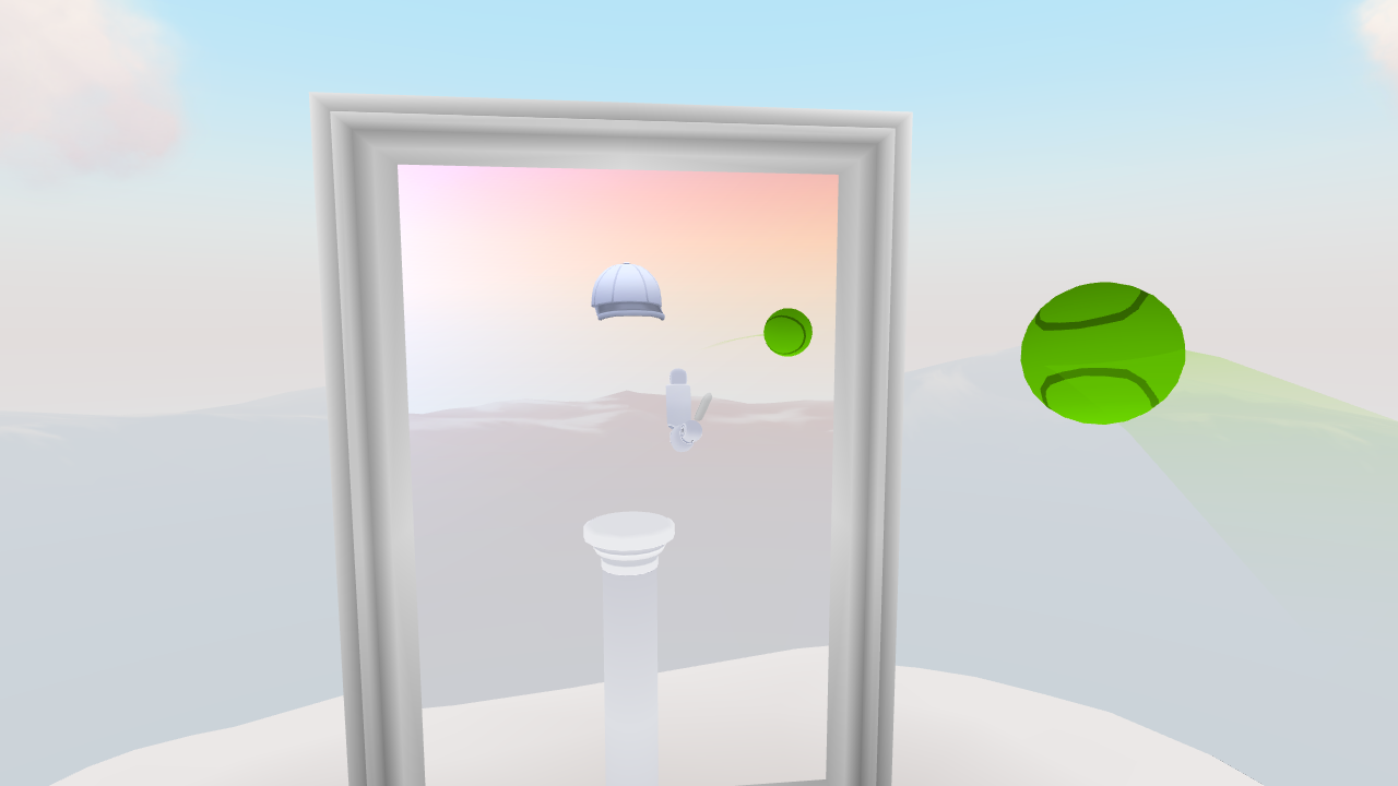 When throwing the ball by releasing the touch pad, the velocity is calculated as an exponential moving average based on the positional changes of the ball as it was held up to the point of release. Then, the direction of the throw is weighted by two factors. First, it is weighted in the forward direction of the controller. Then, the direction is weighted towards the direction that the user is looking.