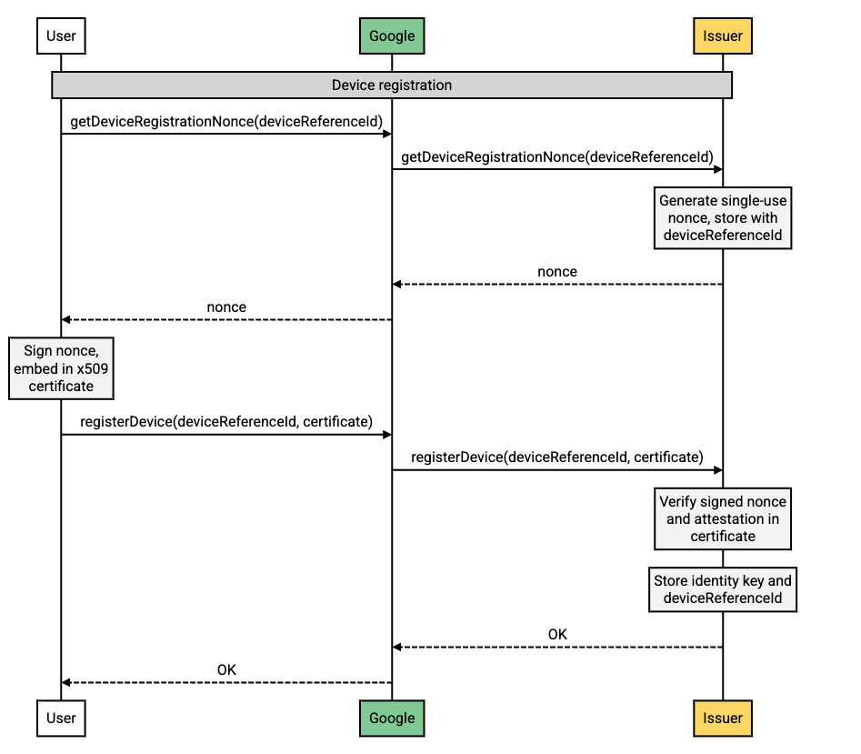 Google retransmite la solicitud getDeviceRegistrationNonce a la entidad emisora.