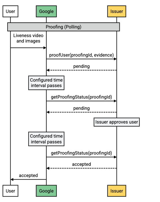 設定的時間間隔再次經過後,Google 會呼叫 getProofingStatus,判斷驗證要求狀態。 |
