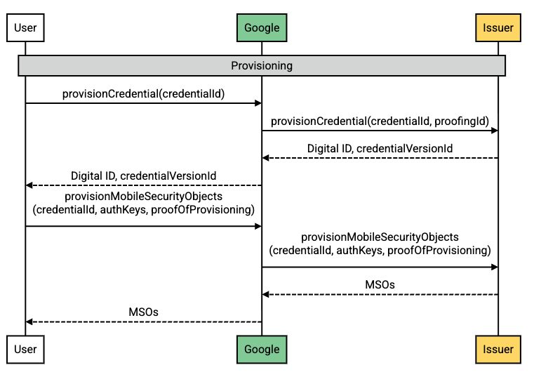 Google 會呼叫 provisionCredential,提供憑證 ID 和校對 ID。 |