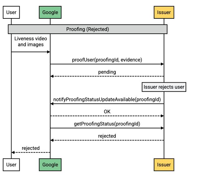 Google ruft proofUser auf und sendet dem Aussteller den Nachweis und eine Proofing-ID.