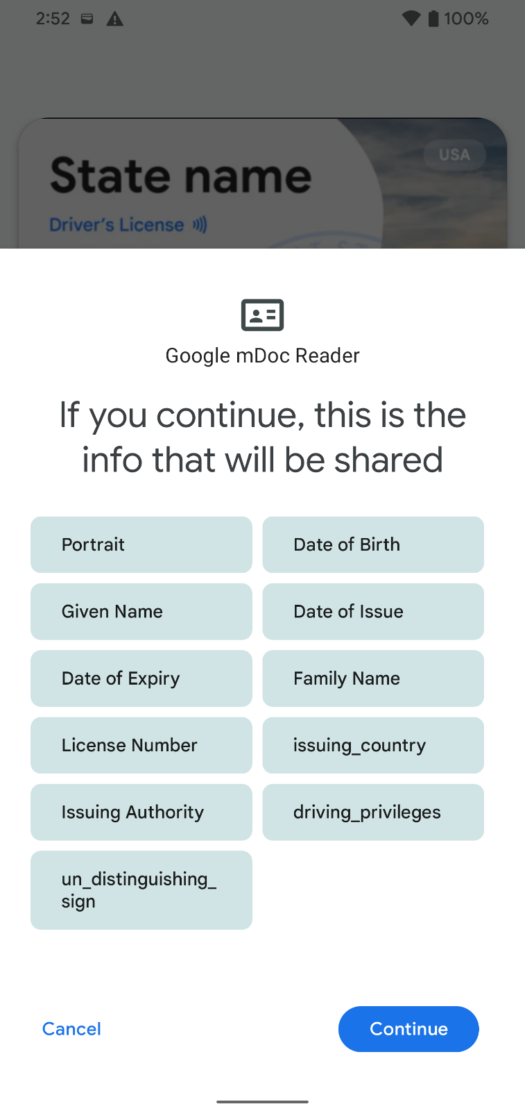 - कार्ड होल्डर के डिवाइस में वाइब्रेशन होगा. इसके बाद, लोडिंग स्क्रीन दिखेगी. इसके बाद, अनुरोध किए गए फ़ील्ड की सूची दिखेगी (अगर स्क्रीन नहीं दिखती है, तो दोनों फ़ोन को अलग-अलग रखें और फिर से कोशिश करें)
