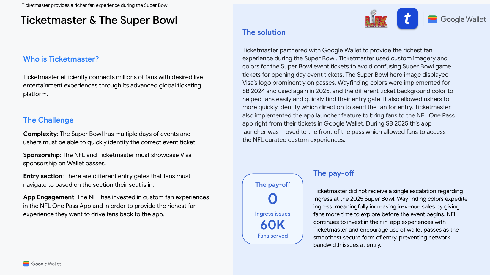সুপার বোল যাচাইকরণ এবং এনগেজমেন্ট পরিচালনা করার জন্য, টিকিটমাস্টার একটি গুগল ওয়ালেট সমাধান ব্যবহার করেছে। এটি সফলভাবে ৬০,০০০ ভক্তকে সেবা দিয়েছে এবং এর ফলে প্রবেশের কোনও সমস্যা হয়নি।