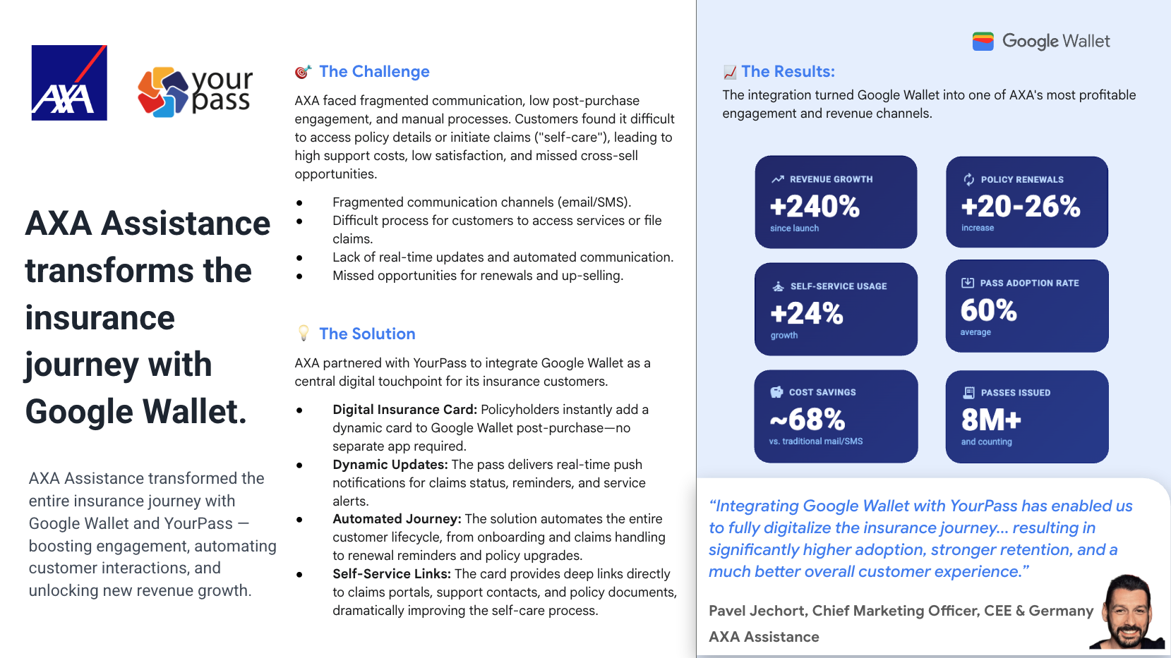 উচ্চ খরচ এবং কম ব্যস্ততা সমাধানের জন্য, AXA একটি কেন্দ্রীয় স্পর্শবিন্দু হিসেবে Google Wallet ব্যবহার করেছে। এর ফলে +২৪০% রাজস্ব বৃদ্ধি, পুনর্নবীকরণে ২০-২৬% বৃদ্ধি এবং ৬৮% খরচ সাশ্রয় হয়েছে।