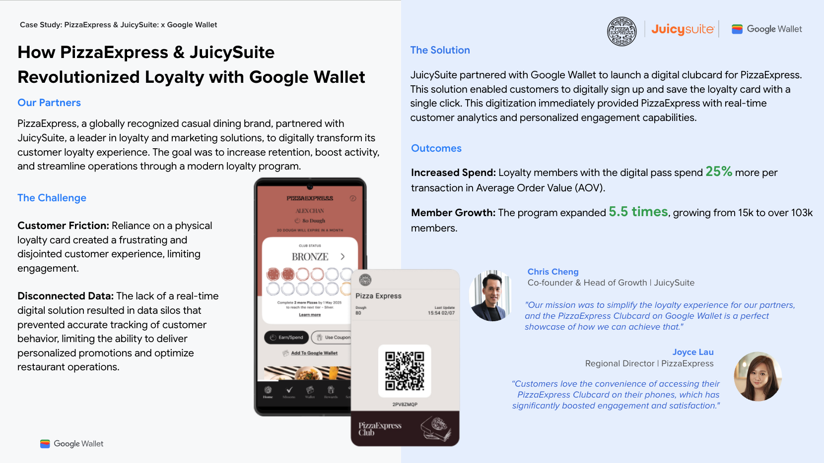 Pizza Express Hong Kong replaced physical loyalty cards with loyalty passes saveable to Google Wallet. The new digital clubcard on Google Wallet helped grow membership by 5.5x. These new digital members also spend 25% more per average transaction.