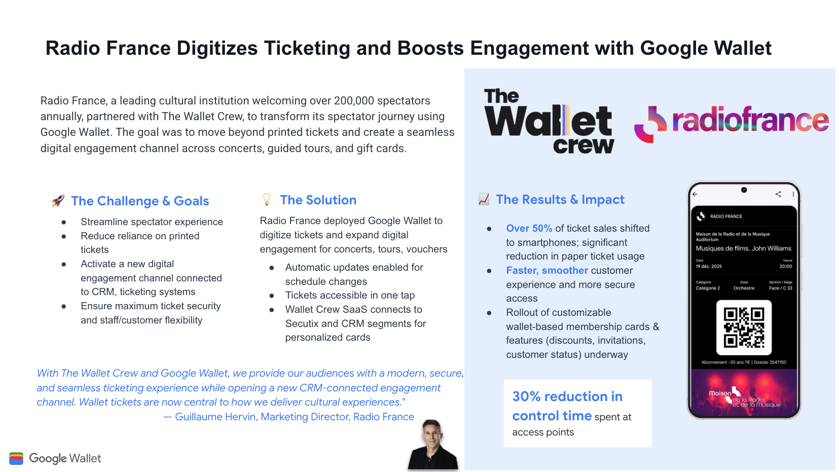Seeking to move beyond printed tickets and engage spectators, Radio France digitized tickets. This shifted over 50% of sales to smartphones and reduced access control time by 30%.