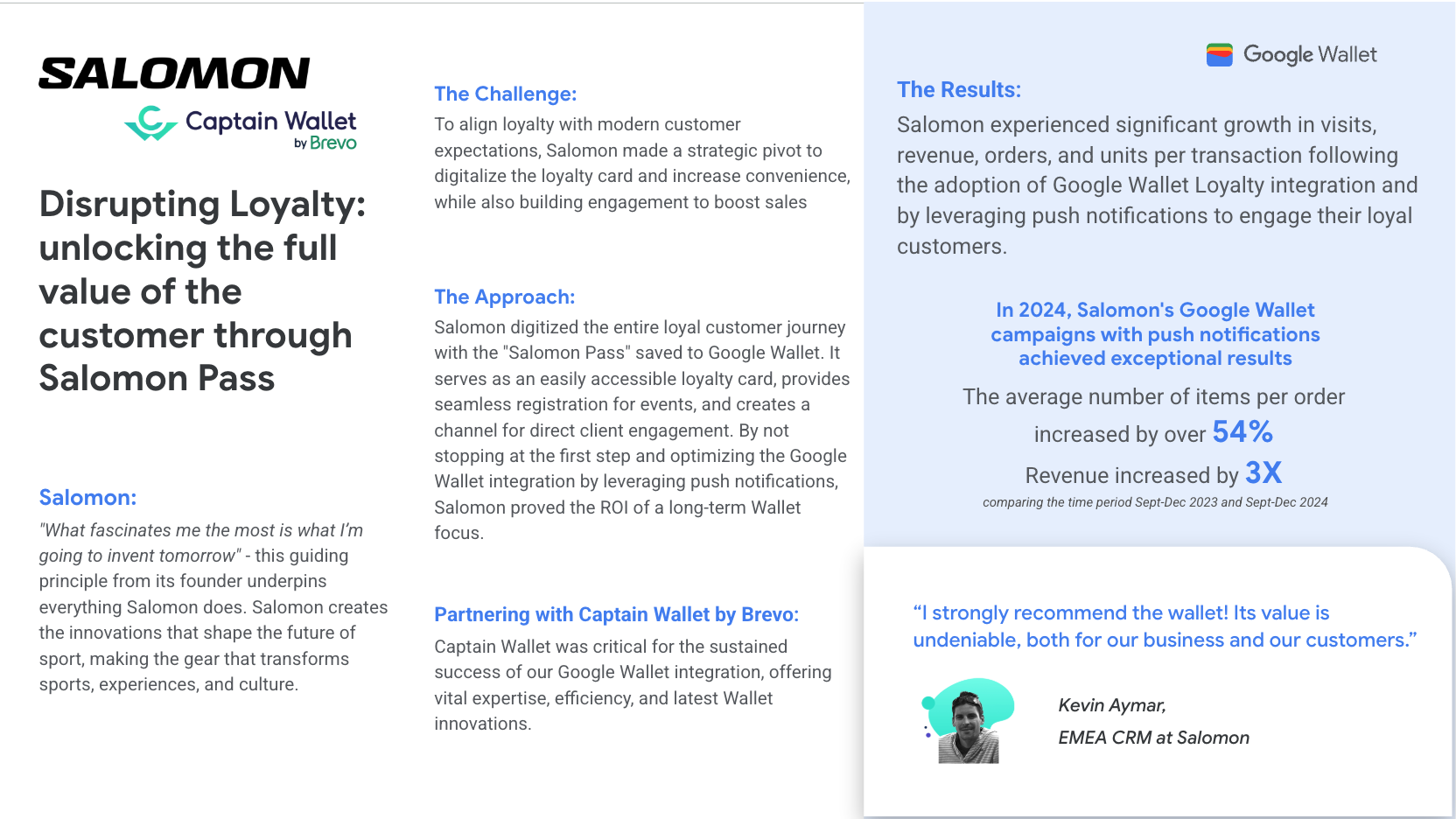 Salomon digitized its "Salomon Pass" to boost engagement. By leveraging Google Wallet push notifications, the brand achieved a 3X increase in revenue and a 54% increase in items per order.