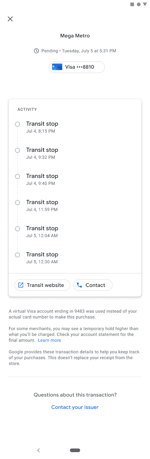 使用行動裝置付款時,使用者可獲得的其中一個主要優勢,就是能夠查看交易詳細資料。Google 錢包提供直覺的使用者介面,讓使用者查看交易記錄。複合式收據包含代理商名稱與標誌, 使用者完成交易的位置地圖。如果代理商使用票價上限,則精簡收據可能也會顯示最終結算的摘要。
