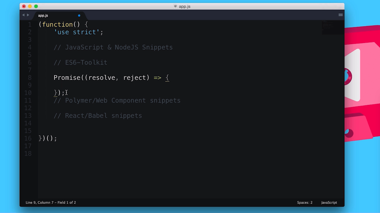 קטעי קוד של JavaScript ו-NodeJS חבילה מאת Zeno Rocha היא חבילה נהדרת של קטעי טקסט פשוטים שמאפשרים לכתוב במהירות קוד JavaScript נפוץ.