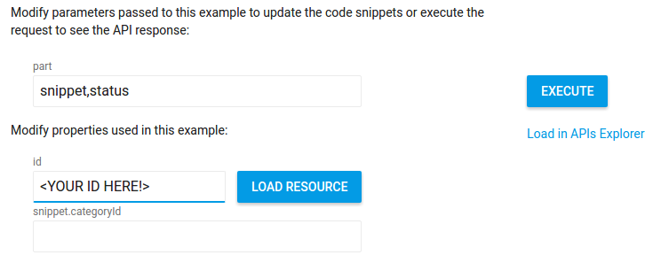 Um eine Anfrage zum Aktualisieren einer vorhandenen Ressource zu testen, können Sie die aktuellen Attributwerte für diese Ressource in das Aktualisierungsformular laden. Wenn du beispielsweise die Metadaten eines Videos aktualisieren möchtest, gib die Video-ID in das Attributfeld id ein und klicke auf die Schaltfläche Ressource laden. Die aktuellen Property-Werte werden in das Formular geladen und Sie können nur die Werte aktualisieren, die Sie ändern möchten.