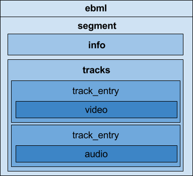 ต่อไปนี้คือเลย์เอาต์ของกลุ่มการเริ่มต้น WebM ตัวอย่าง โดยประกอบด้วยส่วนของสตรีม WebM จนถึงคลัสเตอร์แรก แต่ไม่รวมคลัสเตอร์แรก